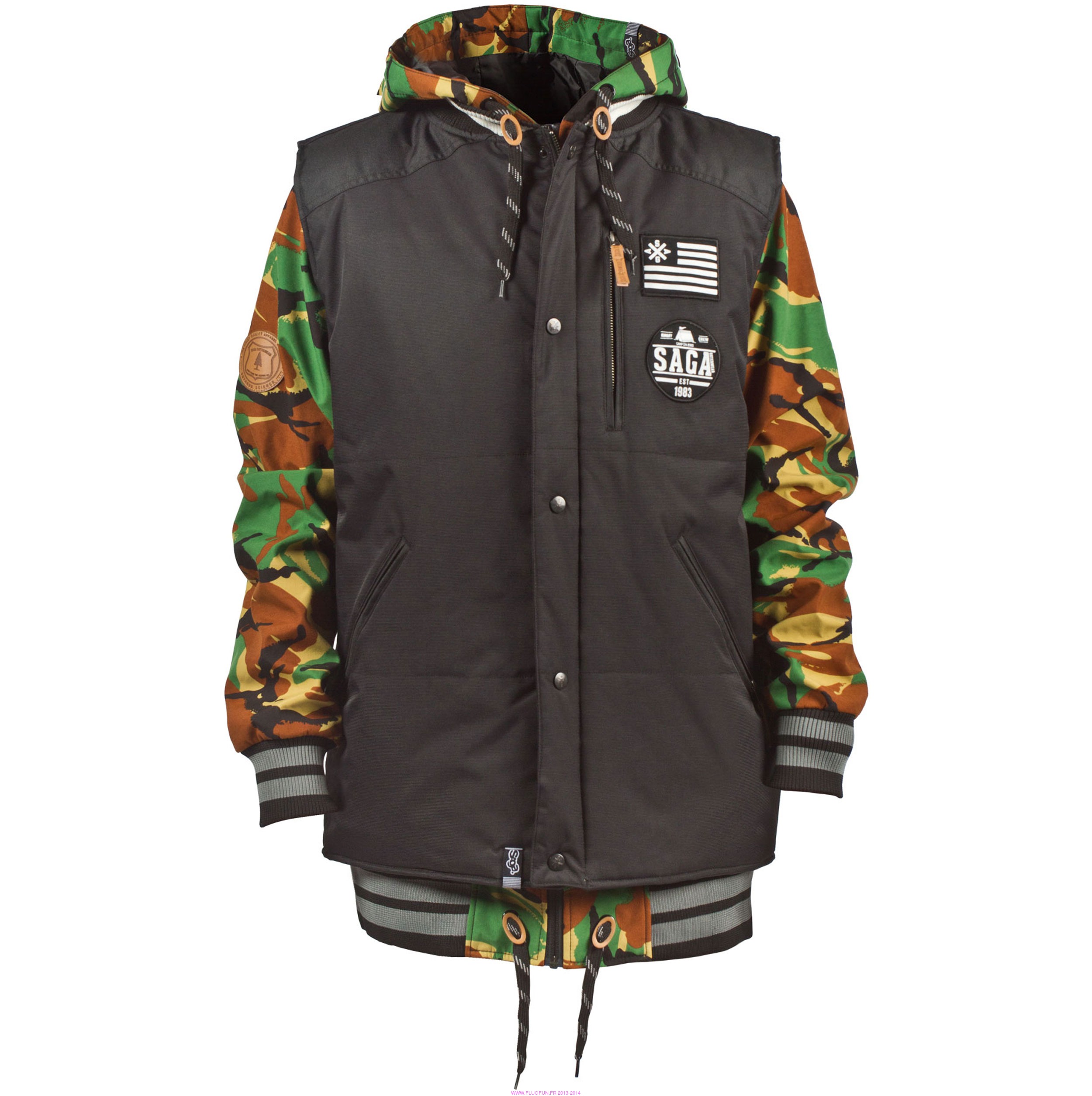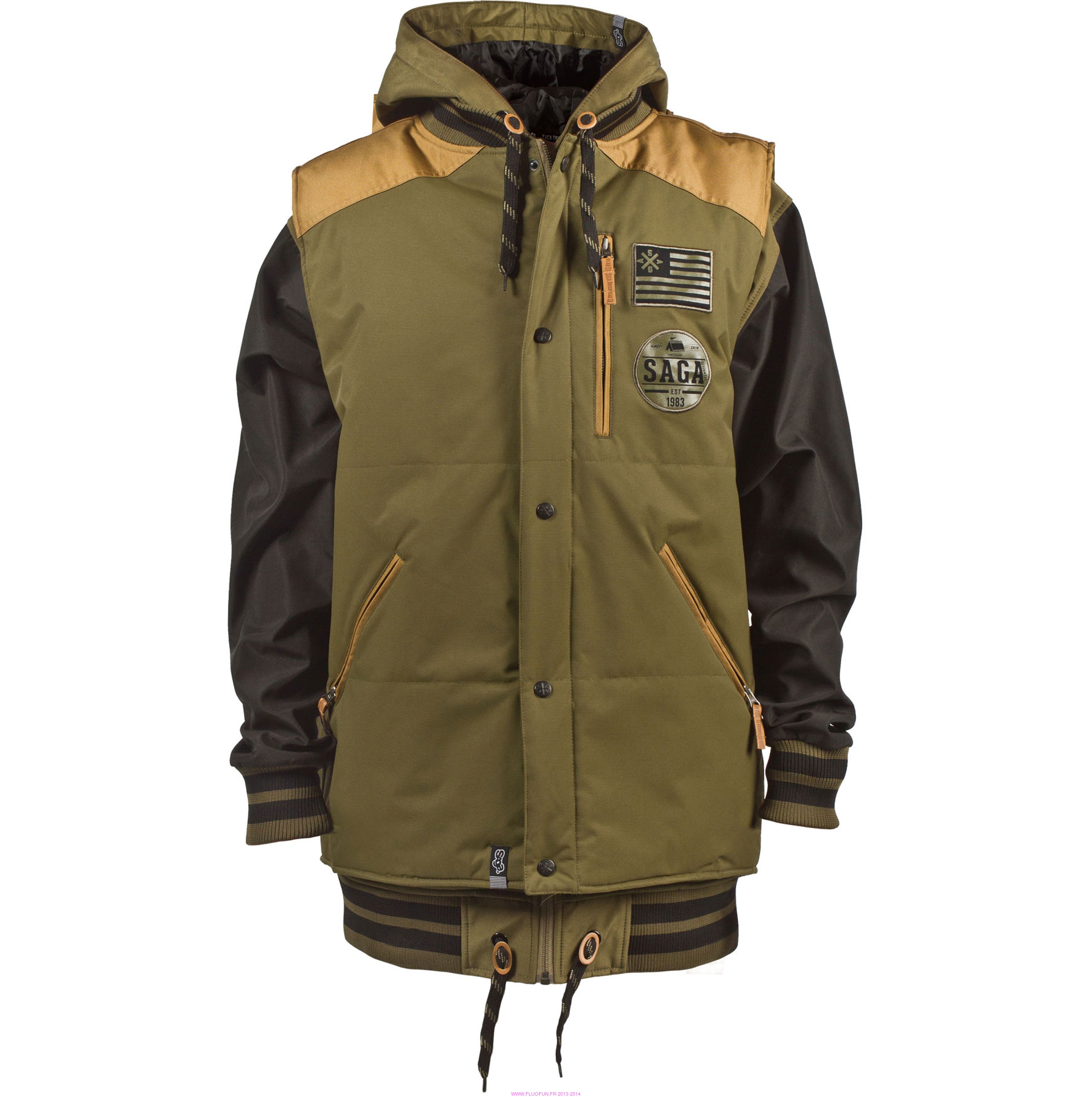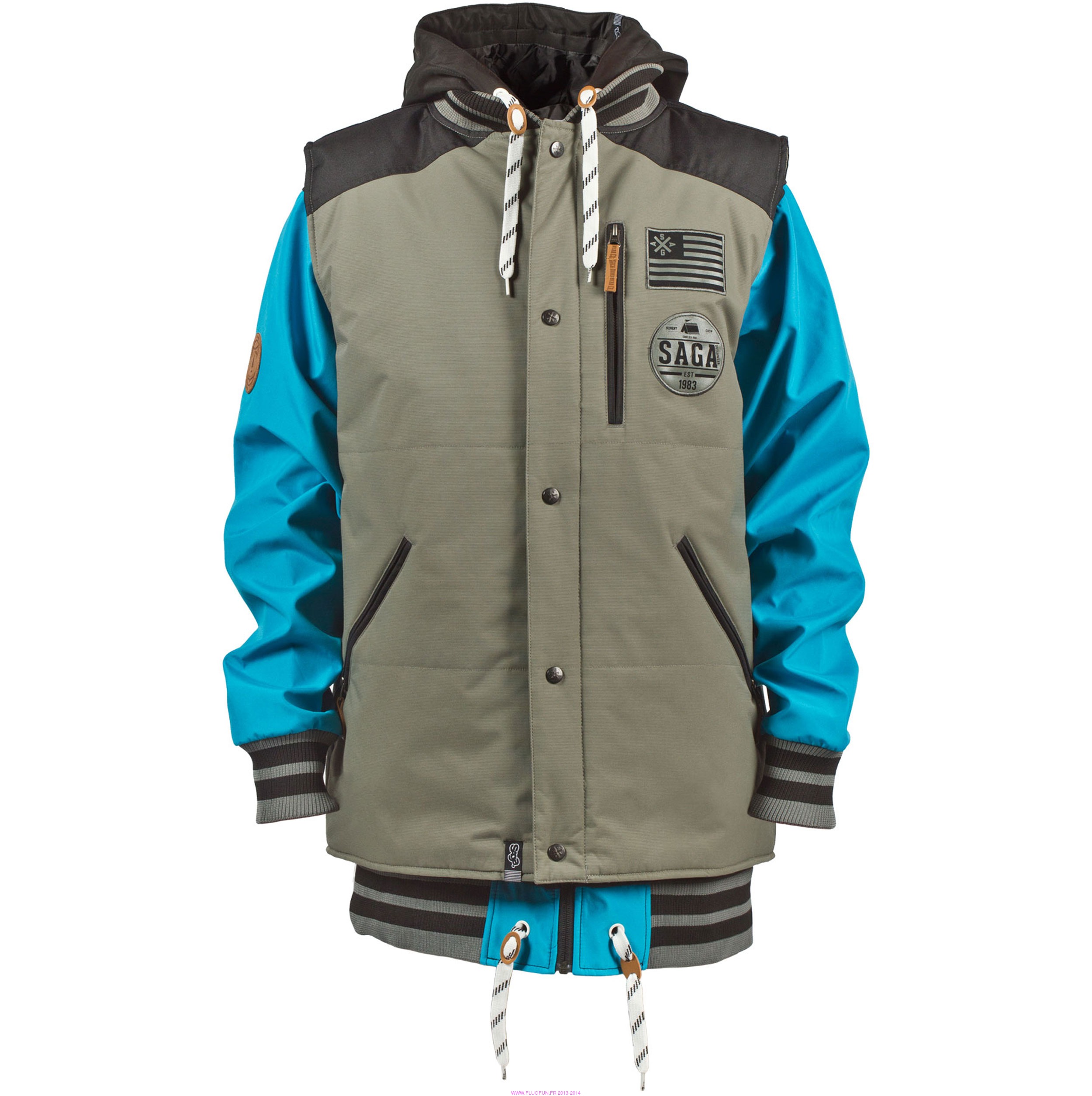 This 2-in-1 piece is fully styled for a day on or off the mountain; wear just the vest, the poly or both, you're covered! Quickly becoming one of our top sellers in 2013, 2014 sholdn't be any different! Vest comes with a quilted insulated liner, audio cord integration and YKK zippers. Poly stems from our SAGA-Tek soft-shell fabric, poly ribbing cuff/hem and hood cinche adjustments. Available in Small -- XX-Large (prix indicatif en euros, prix réel 220$)